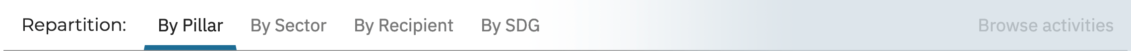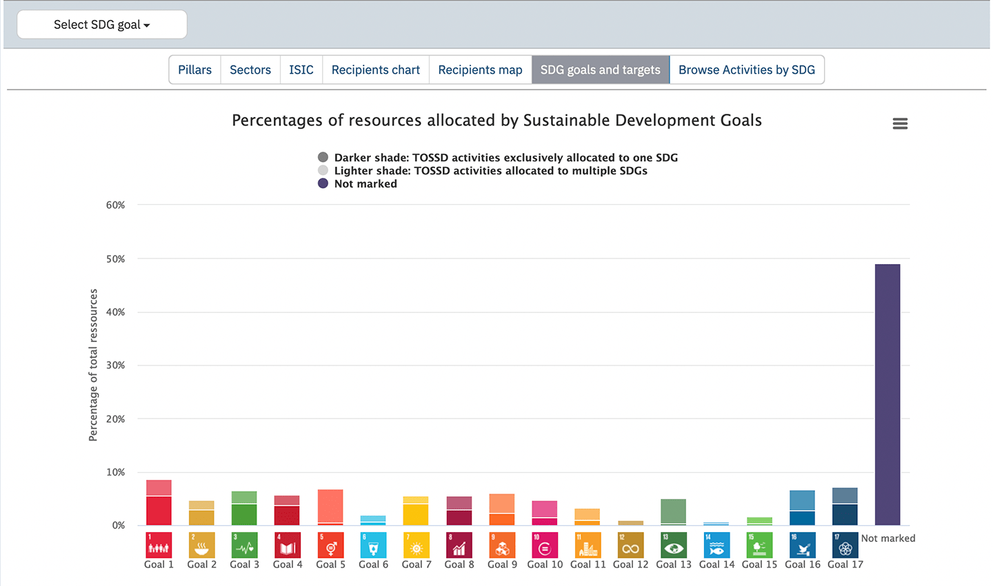 by default showcases the shares for each SDGs. It allows to restrict visualisation to the data identified with one, or more, SDGs. The SDG data can be further visualised by pillar, sector, recipient etc.